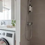 Das Stylish Flat In Trendy Kallio mit Blick auf die Straße besteht aus Wohnbereich, einer Sitzecke und einer Küche und ist mit einer Klimaanlage ausgestattet ist. Dieses Apartment verfügt über ein Badezimmer mit einem Haartrockner, einem Wäschetrockner und Handtüchern. Außerdem gibt es hier ein Bidet, eine getrennte Toilette und eine Dusche.